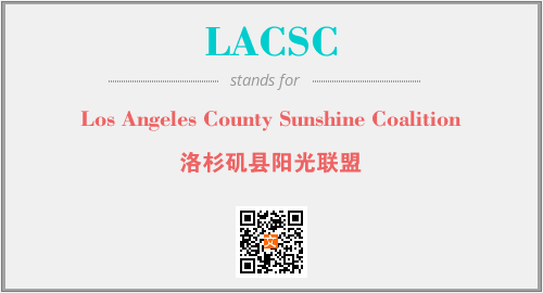 上述内容是“Los Angeles County Sunshine Coalition”作为“LACSC”的缩写,解释为“洛杉矶县阳光联盟”时的信息,以及英文缩略词LACSC所代表的英文单词,其对应的中文拼音、详细解释以及在英文中的流行度和相关分类、应用领域及应用示例等。