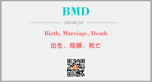 英文缩略词“BMD”经常作为“Birth, Marriage, Death”的英文缩写来使用,中文表示:“出生、结婚、死亡”。本文将详细介绍英文缩写词BMD所代表英文单词,其对应的中文拼音、详细解释以及在英语中的流行度。此外,还有关于缩略词BMD的分类、应用领域及相关应用示例等。
