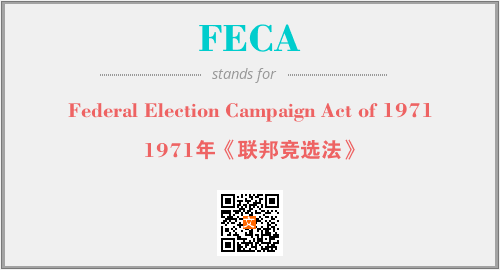 英文缩略词“FECA”经常作为“Federal Election Campaign Act of 1971”的英文缩写来使用,中文表示:“1971年《联邦竞选法》”。本文将详细介绍英文缩写词FECA所代表英文单词,其对应的中文拼音、详细解释以及在英语中的流行度。此外,还有关于缩略词FECA的分类、应用领域及相关应用示例等。