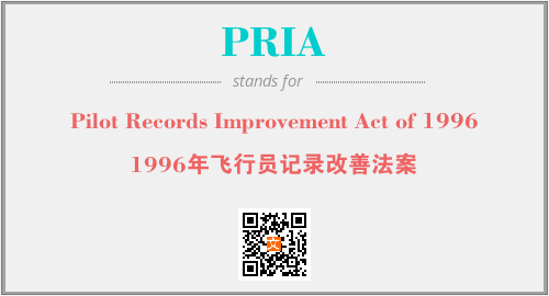 英文缩略词“PRIA”经常作为“Pilot Records Improvement Act of 1996”的英文缩写来使用,中文表示:“1996年飞行员记录改善法案”。本文将详细介绍英文缩写词PRIA所代表英文单词,其对应的中文拼音、详细解释以及在英语中的流行度。此外,还有关于缩略词PRIA的分类、应用领域及相关应用示例等。