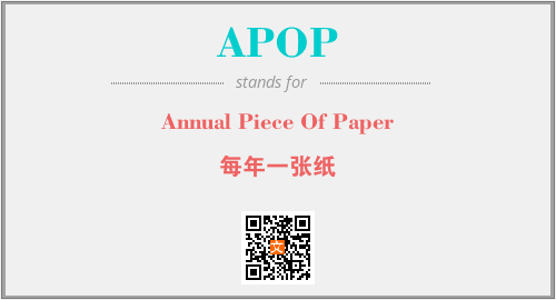 英文缩略词“APOP”经常作为“Annual Piece Of Paper”的英文缩写来使用,中文表示:“每年一张纸”。本文将详细介绍英文缩写词APOP所代表英文单词,其对应的中文拼音、详细解释以及在英语中的流行度。此外,还有关于缩略词APOP的分类、应用领域及相关应用示例等。