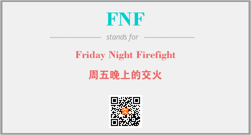 上述内容是“Friday Night Firefight”作为“FNF”的缩写,解释为“周五晚上的交火”时的信息,以及英文缩略词FNF所代表的英文单词,其对应的中文拼音、详细解释以及在英文中的流行度和相关分类、应用领域及应用示例等。