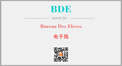英文缩略词“BDE”经常作为“Bureau Des Eleves”的英文缩写来使用,中文表示:“电子局”。本文将详细介绍英文缩写词BDE所代表英文单词,其对应的中文拼音、详细解释以及在英语中的流行度。此外,还有关于缩略词BDE的分类、应用领域及相关应用示例等。