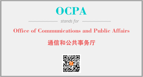 上述内容是“Office of Communications and Public Affairs”作为“OCPA”的缩写,解释为“通信和公共事务厅”时的信息,以及英文缩略词OCPA所代表的英文单词,其对应的中文拼音、详细解释以及在英文中的流行度和相关分类、应用领域及应用示例等。