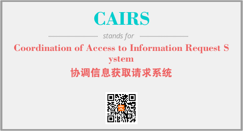 上述内容是“Coordination of Access to Information Request System”作为“CAIRS”的缩写,解释为“协调信息获取请求系统”时的信息,以及英文缩略词CAIRS所代表的英文单词,其对应的中文拼音、详细解释以及在英文中的流行度和相关分类、应用领域及应用示例等。