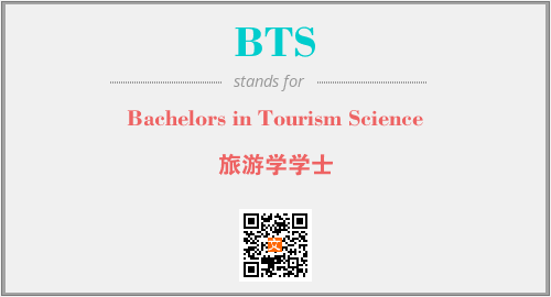 英文缩略词“BTS”经常作为“Bachelors in Tourism Science”的英文缩写来使用,中文表示:“旅游学学士”。本文将详细介绍英文缩写词BTS所代表英文单词,其对应的中文拼音、详细解释以及在英语中的流行度。此外,还有关于缩略词BTS的分类、应用领域及相关应用示例等。