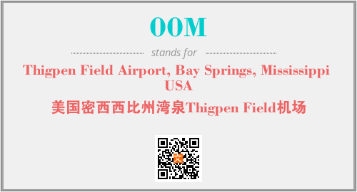 英文缩略词“00M”经常作为“Thigpen Field Airport, Bay Springs, Mississippi USA”的英文缩写来使用,中文表示:“美国密西西比州湾泉Thigpen Field机场”。本文将详细介绍英文缩写词00M所代表英文单词,其对应的中文拼音、详细解释以及在英语中的流行度。此外,还有关于缩略词00M的分类、应用领域及相关应用示例等。
