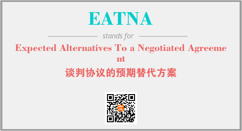 以上为Expected Alternatives To a Negotiated Agreement英文缩略词EATNA的中文解释,以及该英文缩写在英语的流行度、分类和应用领域方面的信息。