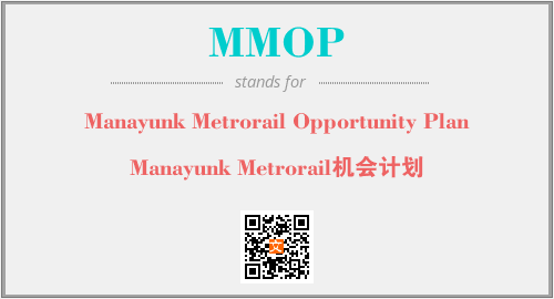 上述内容是“Manayunk Metrorail Opportunity Plan”作为“MMOP”的缩写,解释为“Manayunk Metrorail机会计划”时的信息,以及英文缩略词MMOP所代表的英文单词,其对应的中文拼音、详细解释以及在英文中的流行度和相关分类、应用领域及应用示例等。