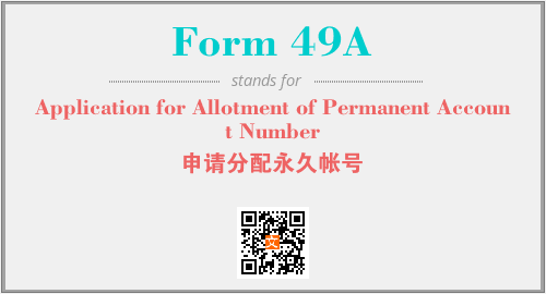 英文缩略词“Form 49A”经常作为“Application for Allotment of Permanent Account Number”的英文缩写来使用,中文表示:“申请分配永久帐号”。本文将详细介绍英文缩写词Form 49A所代表英文单词,其对应的中文拼音、详细解释以及在英语中的流行度。此外,还有关于缩略词Form 49A的分类、应用领域及相关应用示例等。