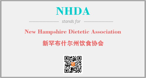 上述内容是“New Hampshire Dietetic Association”作为“NHDA”的缩写,解释为“新罕布什尔州饮食协会”时的信息,以及英文缩略词NHDA所代表的英文单词,其对应的中文拼音、详细解释以及在英文中的流行度和相关分类、应用领域及应用示例等。