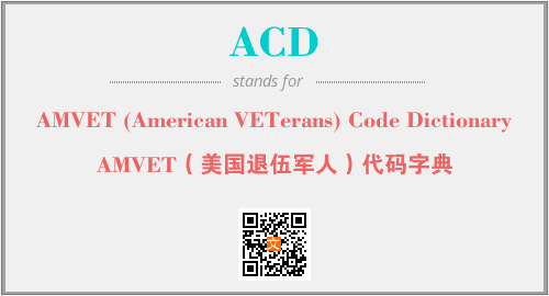 上述内容是“AMVET (American VETerans) Code Dictionary”作为“ACD”的缩写,解释为“AMVET(美国退伍军人)代码字典”时的信息,以及英文缩略词ACD所代表的英文单词,其对应的中文拼音、详细解释以及在英文中的流行度和相关分类、应用领域及应用示例等。