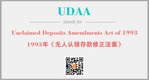 上述内容是“Unclaimed Deposits Amendments Act of 1993”作为“UDAA”的缩写,解释为“1993年《无人认领存款修正法案》”时的信息,以及英文缩略词UDAA所代表的英文单词,其对应的中文拼音、详细解释以及在英文中的流行度和相关分类、应用领域及应用示例等。