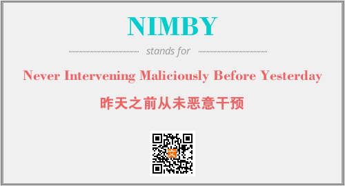 上述内容是“Never Intervening Maliciously Before Yesterday”作为“NIMBY”的缩写,解释为“昨天之前从未恶意干预”时的信息,以及英文缩略词NIMBY所代表的英文单词,其对应的中文拼音、详细解释以及在英文中的流行度和相关分类、应用领域及应用示例等。