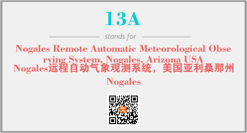 上述内容是“Nogales Remote Automatic Meteorological Observing System, Nogales, Arizona USA”作为“13A”的缩写,解释为“Nogales远程自动气象观测系统,美国亚利桑那州Nogales”时的信息,以及英文缩略词13A所代表的英文单词,其对应的中文拼音、详细解释以及在英文中的流行度和相关分类、应用领域及应用示例等。