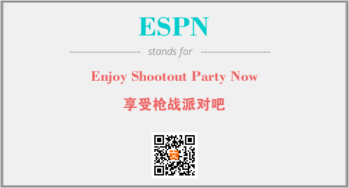 英文缩略词“ESPN”经常作为“Enjoy Shootout Party Now”的英文缩写来使用,中文表示:“享受枪战派对吧”。本文将详细介绍英文缩写词ESPN所代表英文单词,其对应的中文拼音、详细解释以及在英语中的流行度。此外,还有关于缩略词ESPN的分类、应用领域及相关应用示例等。