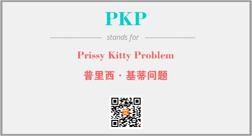 上述内容是“Prissy Kitty Problem”作为“PKP”的缩写,解释为“普里西·基蒂问题”时的信息,以及英文缩略词PKP所代表的英文单词,其对应的中文拼音、详细解释以及在英文中的流行度和相关分类、应用领域及应用示例等。