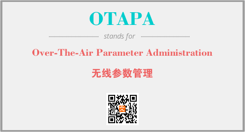 英文缩略词“OTAPA”经常作为“Over-The-Air Parameter Administration”的英文缩写来使用,中文表示:“无线参数管理”。本文将详细介绍英文缩写词OTAPA所代表英文单词,其对应的中文拼音、详细解释以及在英语中的流行度。此外,还有关于缩略词OTAPA的分类、应用领域及相关应用示例等。
