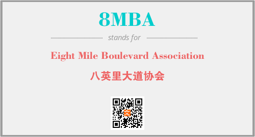 英文缩略词“8MBA”经常作为“Eight Mile Boulevard Association”的英文缩写来使用,中文表示:“八英里大道协会”。本文将详细介绍英文缩写词8MBA所代表英文单词,其对应的中文拼音、详细解释以及在英语中的流行度。此外,还有关于缩略词8MBA的分类、应用领域及相关应用示例等。