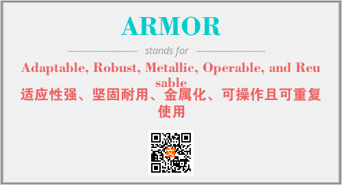 上述内容是“Adaptable, Robust, Metallic, Operable, and Reusable”作为“ARMOR”的缩写,解释为“适应性强、坚固耐用、金属化、可操作且可重复使用”时的信息,以及英文缩略词ARMOR所代表的英文单词,其对应的中文拼音、详细解释以及在英文中的流行度和相关分类、应用领域及应用示例等。