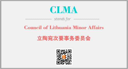 上述内容是“Council of Lithuania Minor Affairs”作为“CLMA”的缩写,解释为“立陶宛次要事务委员会”时的信息,以及英文缩略词CLMA所代表的英文单词,其对应的中文拼音、详细解释以及在英文中的流行度和相关分类、应用领域及应用示例等。