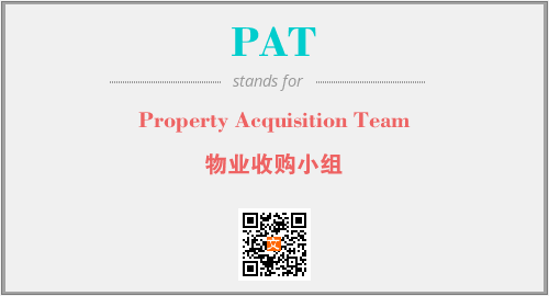 上述内容是“Property Acquisition Team”作为“PAT”的缩写,解释为“物业收购小组”时的信息,以及英文缩略词PAT所代表的英文单词,其对应的中文拼音、详细解释以及在英文中的流行度和相关分类、应用领域及应用示例等。
