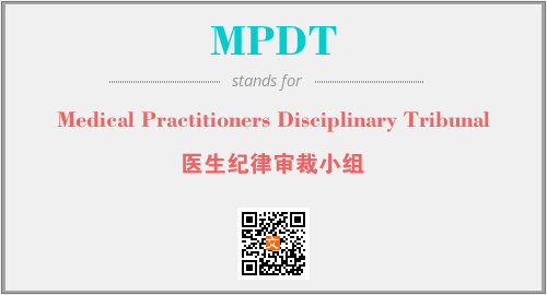上述内容是“Medical Practitioners Disciplinary Tribunal”作为“MPDT”的缩写,解释为“医生纪律审裁小组”时的信息,以及英文缩略词MPDT所代表的英文单词,其对应的中文拼音、详细解释以及在英文中的流行度和相关分类、应用领域及应用示例等。