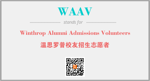 上述内容是“Winthrop Alumni Admissions Volunteers”作为“WAAV”的缩写,解释为“温思罗普校友招生志愿者”时的信息,以及英文缩略词WAAV所代表的英文单词,其对应的中文拼音、详细解释以及在英文中的流行度和相关分类、应用领域及应用示例等。