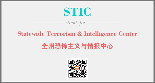 上述内容是“Statewide Terrorism & Intelligence Center”作为“STIC”的缩写,解释为“全州恐怖主义与情报中心”时的信息,以及英文缩略词STIC所代表的英文单词,其对应的中文拼音、详细解释以及在英文中的流行度和相关分类、应用领域及应用示例等。