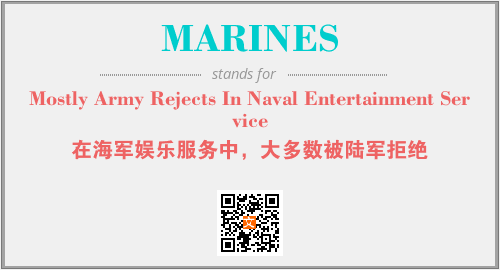 上述内容是“Mostly Army Rejects In Naval Entertainment Service”作为“MARINES”的缩写,解释为“在海军娱乐服务中,大多数被陆军拒绝”时的信息,以及英文缩略词MARINES所代表的英文单词,其对应的中文拼音、详细解释以及在英文中的流行度和相关分类、应用领域及应用示例等。