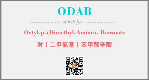 上述内容是“Octyl-p-(Dimethyl-Amino)- Benzoate”作为“ODAB”的缩写,解释为“对(二甲氨基)苯甲酸辛酯”时的信息,以及英文缩略词ODAB所代表的英文单词,其对应的中文拼音、详细解释以及在英文中的流行度和相关分类、应用领域及应用示例等。