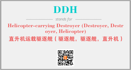 英文缩略词“DDH”经常作为“Helicopter-carrying Destroyer (Destroyer, Destroyer, Helicopter)”的英文缩写来使用,中文表示:“直升机运载驱逐舰(驱逐舰,驱逐舰,直升机)”。本文将详细介绍英文缩写词DDH所代表英文单词,其对应的中文拼音、详细解释以及在英语中的流行度。此外,还有关于缩略词DDH的分类、应用领域及相关应用示例等。