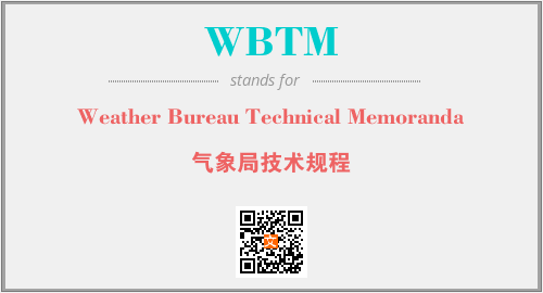 英文缩略词“WBTM”经常作为“Weather Bureau Technical Memoranda”的英文缩写来使用,中文表示:“气象局技术规程”。本文将详细介绍英文缩写词WBTM所代表英文单词,其对应的中文拼音、详细解释以及在英语中的流行度。此外,还有关于缩略词WBTM的分类、应用领域及相关应用示例等。
