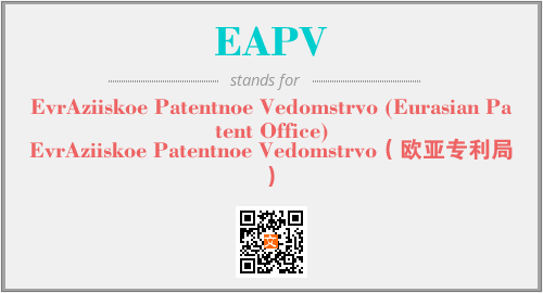 以上为EvrAziiskoe Patentnoe Vedomstrvo (Eurasian Patent Office)英文缩略词EAPV的中文解释,以及该英文缩写在英语的流行度、分类和应用领域方面的信息。