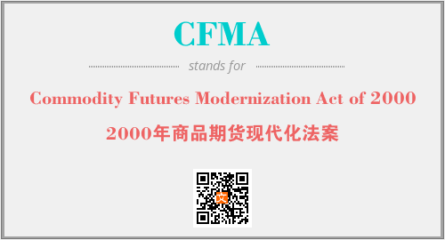英文缩略词“CFMA”经常作为“Commodity Futures Modernization Act of 2000”的英文缩写来使用,中文表示:“2000年商品期货现代化法案”。本文将详细介绍英文缩写词CFMA所代表英文单词,其对应的中文拼音、详细解释以及在英语中的流行度。此外,还有关于缩略词CFMA的分类、应用领域及相关应用示例等。