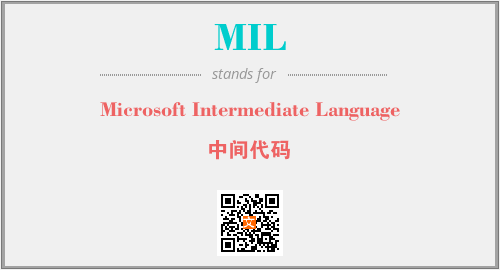 上述内容是“Microsoft Intermediate Language”作为“MIL”的缩写,解释为“中间代码”时的信息,以及英文缩略词MIL所代表的英文单词,其对应的中文拼音、详细解释以及在英文中的流行度和相关分类、应用领域及应用示例等。