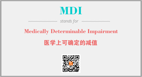 上述内容是“Medically Determinable Impairment”作为“MDI”的缩写,解释为“医学上可确定的减值”时的信息,以及英文缩略词MDI所代表的英文单词,其对应的中文拼音、详细解释以及在英文中的流行度和相关分类、应用领域及应用示例等。