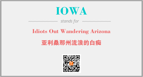 上述内容是“Idiots Out Wandering Arizona”作为“IOWA”的缩写,解释为“亚利桑那州流浪的白痴”时的信息,以及英文缩略词IOWA所代表的英文单词,其对应的中文拼音、详细解释以及在英文中的流行度和相关分类、应用领域及应用示例等。