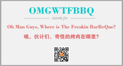 以上为Oh Man Guys, Where is The Freakin BarBeQue?英文缩略词OMGWTFBBQ的中文解释,以及该英文缩写在英语的流行度、分类和应用领域方面的信息。