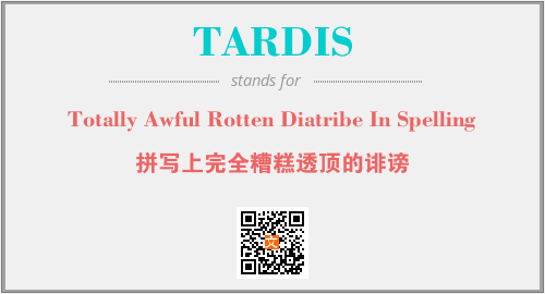 以上为Totally Awful Rotten Diatribe In Spelling英文缩略词TARDIS的中文解释,以及该英文缩写在英语的流行度、分类和应用领域方面的信息。