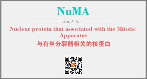 上述内容是“Nuclear protein that associated with the Mitotic Apparatus”作为“NuMA”的缩写,解释为“与有丝分裂器相关的核蛋白”时的信息,以及英文缩略词NuMA所代表的英文单词,其对应的中文拼音、详细解释以及在英文中的流行度和相关分类、应用领域及应用示例等。