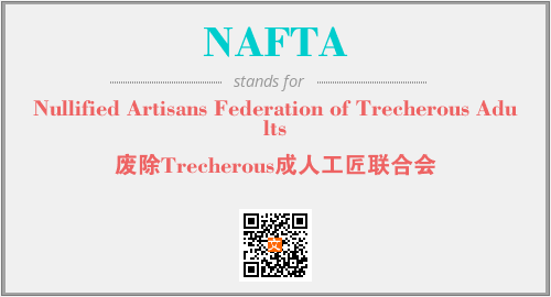 上述内容是“Nullified Artisans Federation of Trecherous Adults”作为“NAFTA”的缩写,解释为“废除Trecherous成人工匠联合会”时的信息,以及英文缩略词NAFTA所代表的英文单词,其对应的中文拼音、详细解释以及在英文中的流行度和相关分类、应用领域及应用示例等。