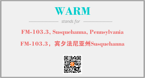 上述内容是“FM-103.3, Susquehanna, Pennsylvania”作为“WARM”的缩写,解释为“FM-103.3,宾夕法尼亚州Susquehanna”时的信息,以及英文缩略词WARM所代表的英文单词,其对应的中文拼音、详细解释以及在英文中的流行度和相关分类、应用领域及应用示例等。