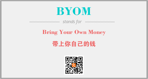 英文缩略词“BYOM”经常作为“Bring Your Own Money”的英文缩写来使用,中文表示:“带上你自己的钱”。本文将详细介绍英文缩写词BYOM所代表英文单词,其对应的中文拼音、详细解释以及在英语中的流行度。此外,还有关于缩略词BYOM的分类、应用领域及相关应用示例等。