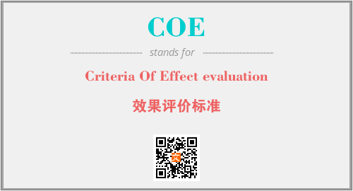 英文缩略词“COE”经常作为“Criteria Of Effect evaluation”的英文缩写来使用,中文表示:“效果评价标准”。本文将详细介绍英文缩写词COE所代表英文单词,其对应的中文拼音、详细解释以及在英语中的流行度。此外,还有关于缩略词COE的分类、应用领域及相关应用示例等。