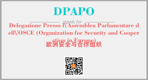 上述内容是“Delegazione Presso l\'Assemblea Parlamentare dell\'OSCE (Organization for Security and Cooperation in Europe)”作为“DPAPO”的缩写,解释为“欧洲安全与合作组织”时的信息,以及英文缩略词DPAPO所代表的英文单词,其对应的中文拼音、详细解释以及在英文中的流行度和相关分类、应用领域及应用示例等。