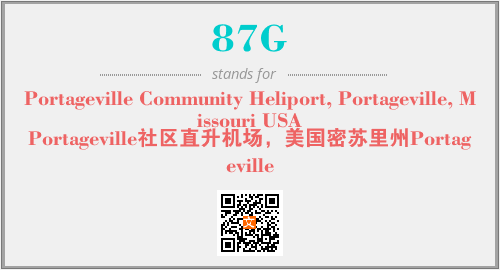 上述内容是“Portageville Community Heliport, Portageville, Missouri USA”作为“87G”的缩写,解释为“Portageville社区直升机场,美国密苏里州Portageville”时的信息,以及英文缩略词87G所代表的英文单词,其对应的中文拼音、详细解释以及在英文中的流行度和相关分类、应用领域及应用示例等。