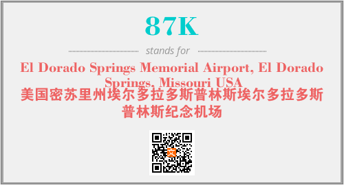 上述内容是“El Dorado Springs Memorial Airport, El Dorado Springs, Missouri USA”作为“87K”的缩写,解释为“美国密苏里州埃尔多拉多斯普林斯埃尔多拉多斯普林斯纪念机场”时的信息,以及英文缩略词87K所代表的英文单词,其对应的中文拼音、详细解释以及在英文中的流行度和相关分类、应用领域及应用示例等。