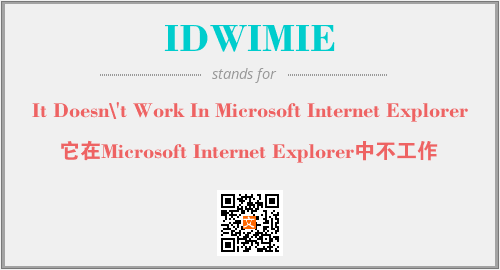 上述内容是“It Doesn\'t Work In Microsoft Internet Explorer”作为“IDWIMIE”的缩写,解释为“它在Microsoft Internet Explorer中不工作”时的信息,以及英文缩略词IDWIMIE所代表的英文单词,其对应的中文拼音、详细解释以及在英文中的流行度和相关分类、应用领域及应用示例等。