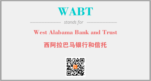 上述内容是“West Alabama Bank and Trust”作为“WABT”的缩写,解释为“西阿拉巴马银行和信托”时的信息,以及英文缩略词WABT所代表的英文单词,其对应的中文拼音、详细解释以及在英文中的流行度和相关分类、应用领域及应用示例等。